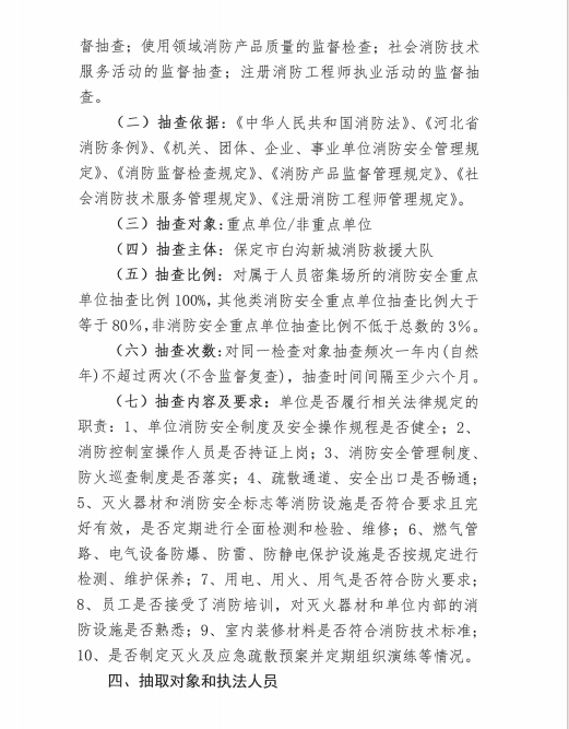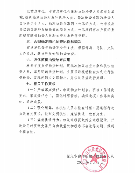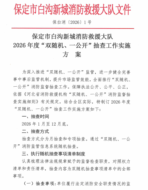 保定市白沟新城消防救援大队2026年度“双随机、一公开”抽查工作方案