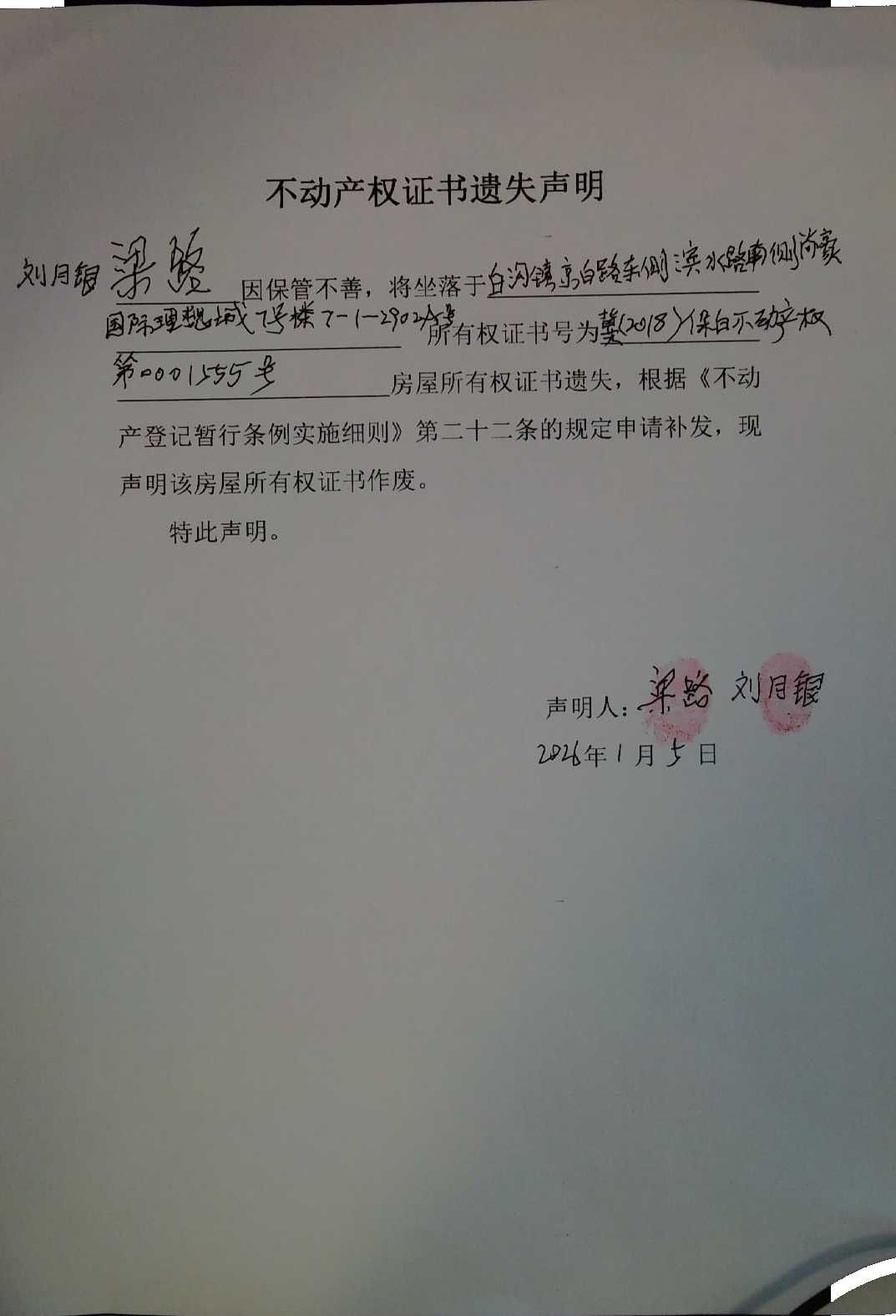 不动产权证书遗失声明