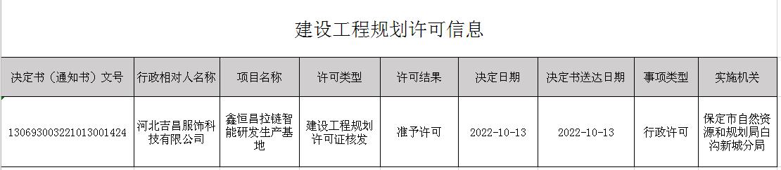 鑫恒昌拉链智能研发生产基地项目建设工程规划许可信息