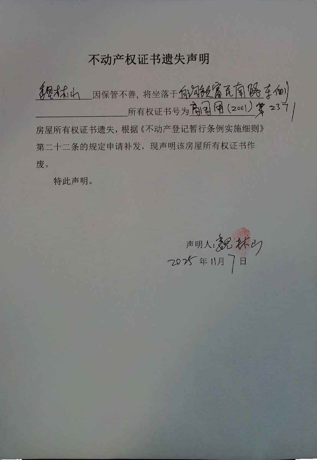 不动产权证书遗失声明