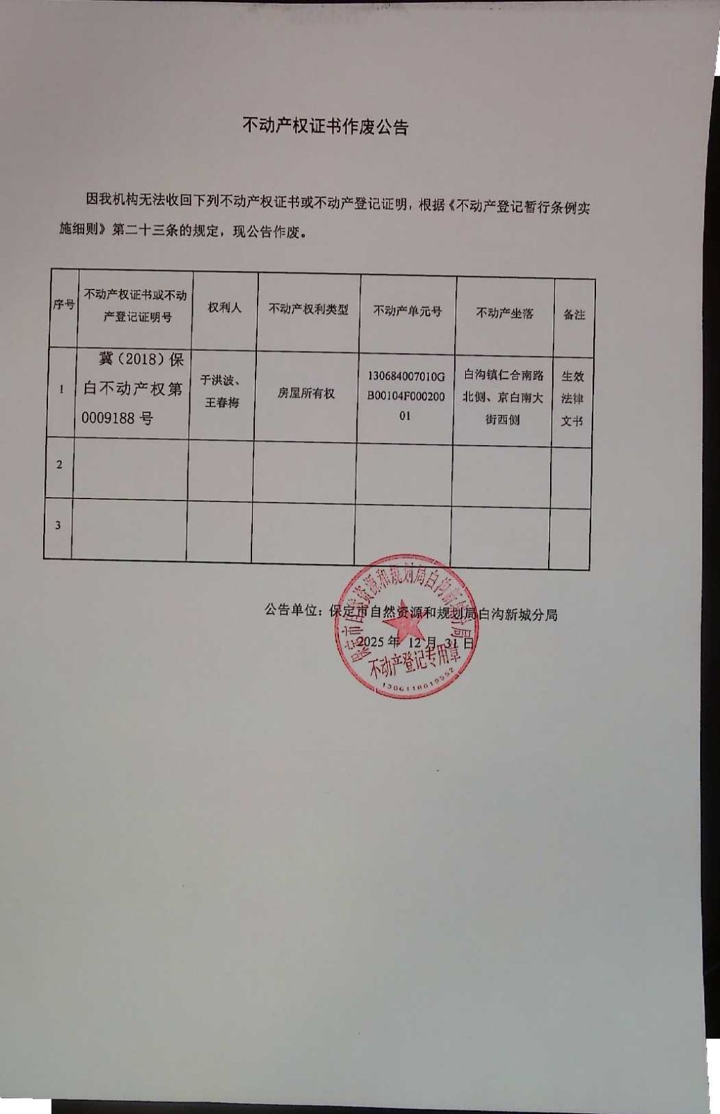 不动产权证书作废公告