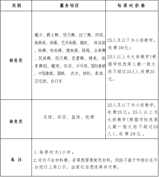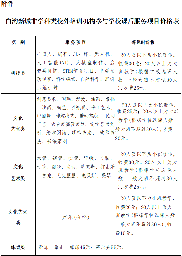 代收费:非学科类“白名单”校外培训机构参与学校课后服务的,费用标准要明显低于培训机构在校外提供同质培训服务的收费标准,具体价格参照附件。